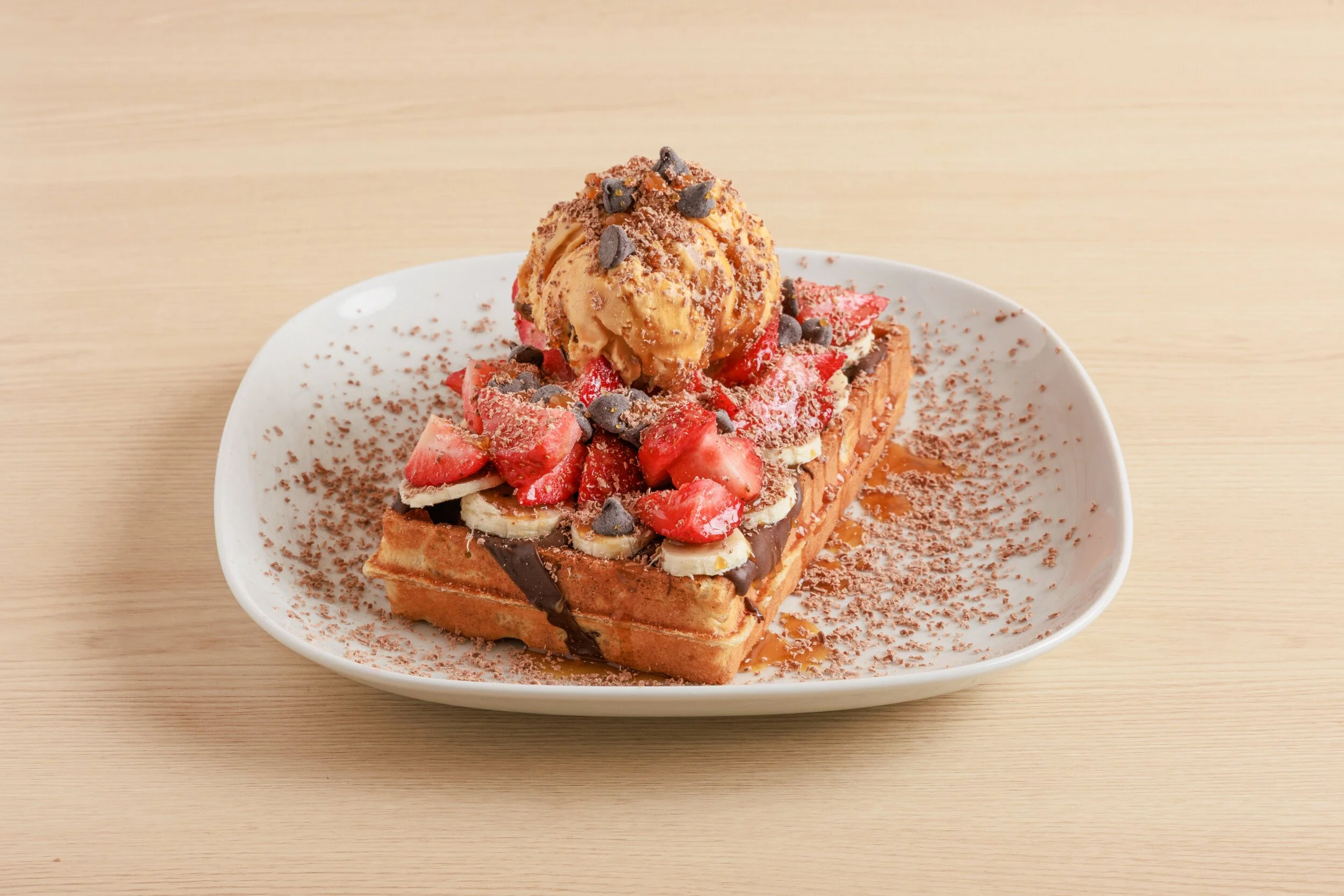 Decadence meets delight in this chocolate lover’s dream. A crispy Belgian waffle topped with dark chocolate sauce, fresh banana and strawberry slices, a scoop of caramel ice cream, and a drizzle of golden caramel sauce. Finished with chocolate chips and a sprinkle of chocolate zest for the perfect sweet-and-salty balance.