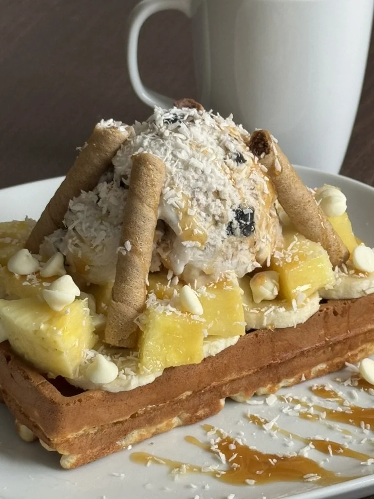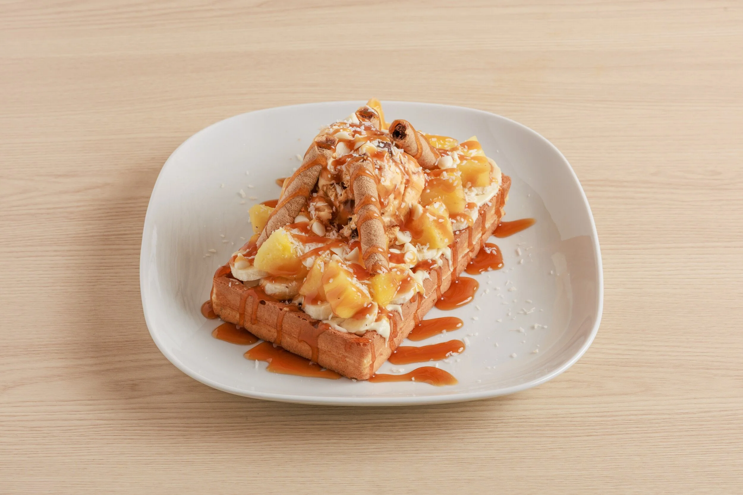 Escape to paradise with every bite. A crispy Belgian waffle topped with creamy white chocolate, fresh banana and pineapple, crunchy wafers, white chocolate chips, and a scoop of smooth caramel ice cream. Finished with a sprinkle of coconut flakes and a drizzle of rich caramel sauce — this is your ultimate tropical getaway on a waffle.
