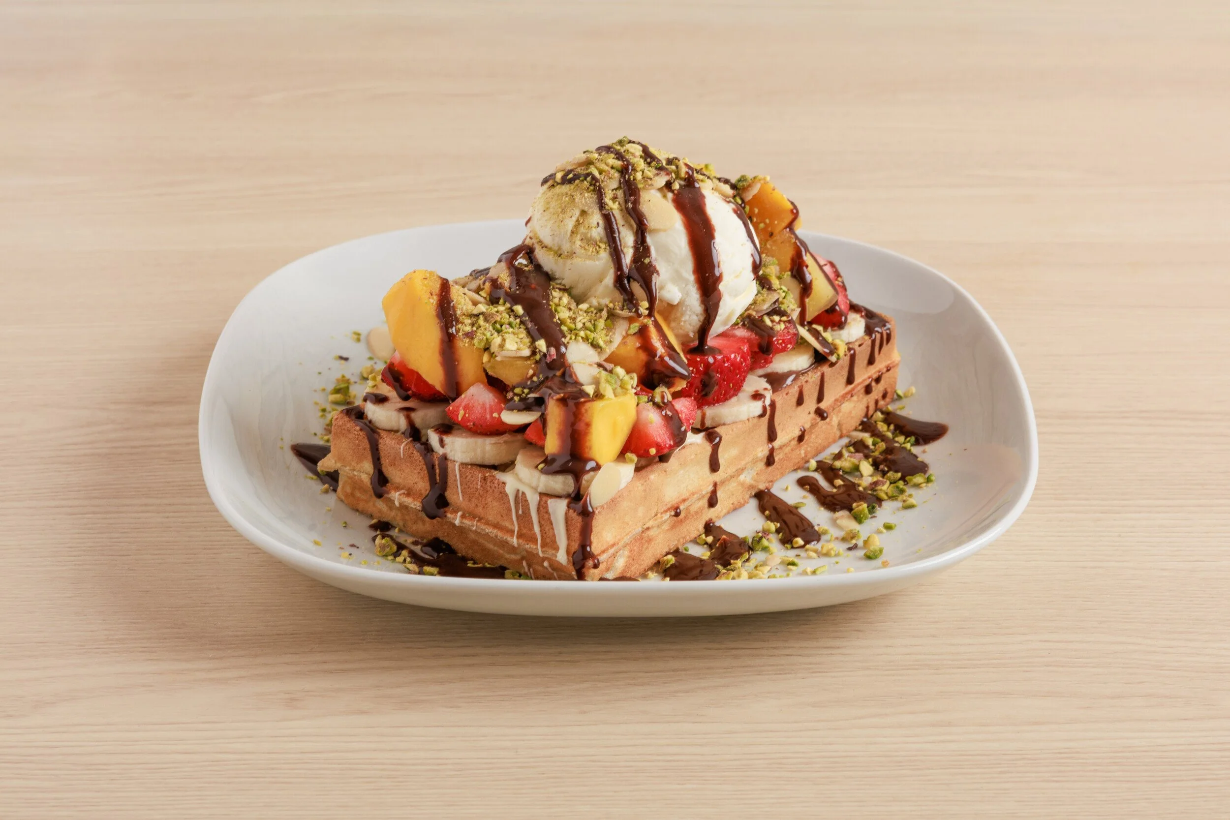 Can’t decide? Get it all. This crispy Belgian waffle is stacked with a rich base of white chocolate and Nutella, then loaded with fresh banana, strawberry, pineapple, and mango. Topped with a scoop of creamy vanilla ice cream, a generous drizzle of chocolate sauce, and finished with crushed almonds and a sprinkle of pistachio powder. It’s sweet, nutty, fruity, and completely unforgettable — everything you love, on one perfect waffle.